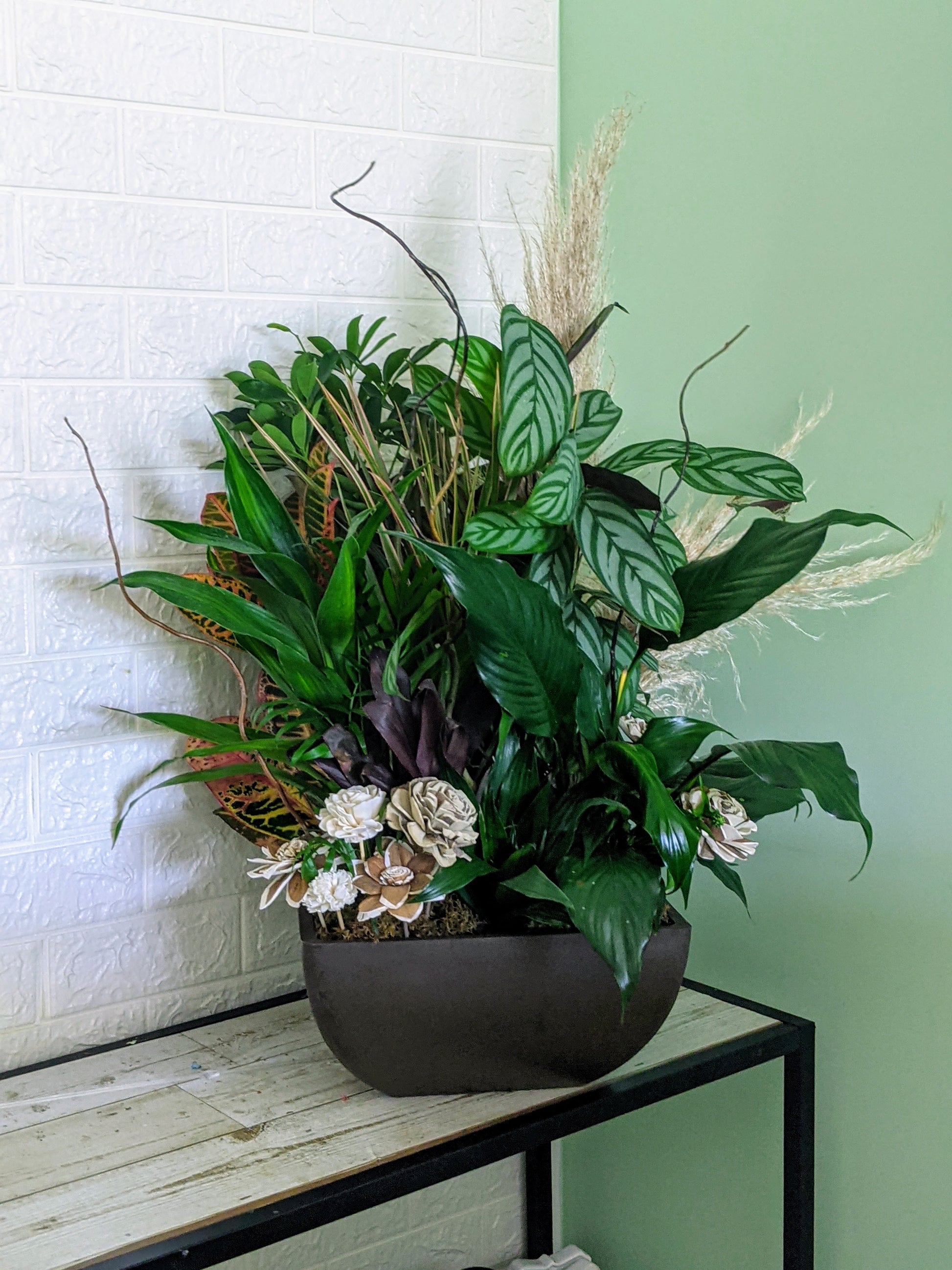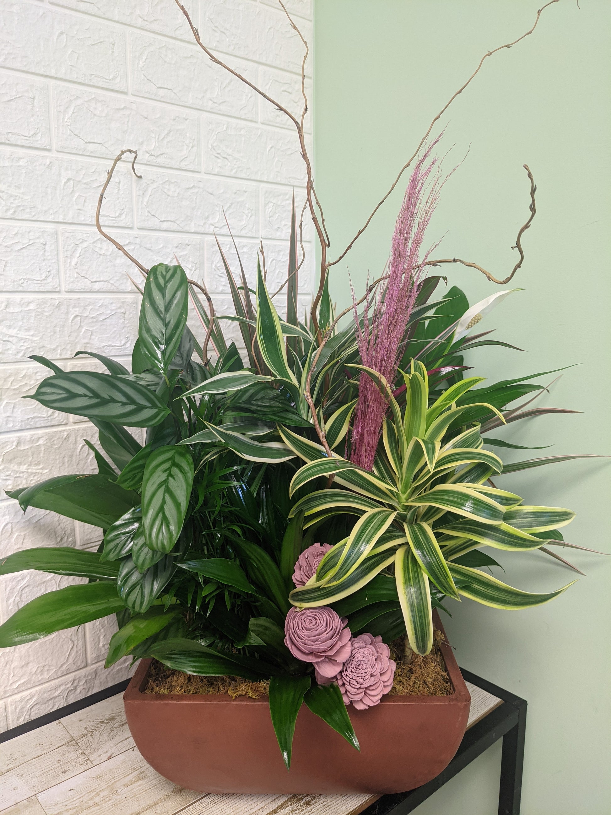 A charming mix of green plants and florals mixed in a decorative container - ideal for the office, homes or thoughtful sympathy gestures.